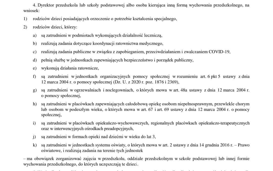 Wymogiem zorganizowania zajęć w przedszkolu dla dzieci rodziców wskazanych w w/w rozporządzeniu jest złożenie pisemnego wniosku do Dyrektora przedszkola wraz z ankietą o zorganizowanie zajęć.